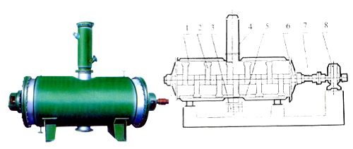 1、殼體 2、耙齒 3、出料裝置 4、加料裝置 5、粉碎棒 6、密封裝置 7、攪拌軸 8 、傳動(dòng)裝置