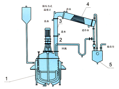 ![]() 1、反應鍋 2、豎式分餾柱 3、豎式冷凝器 4、臥式冷凝器 |